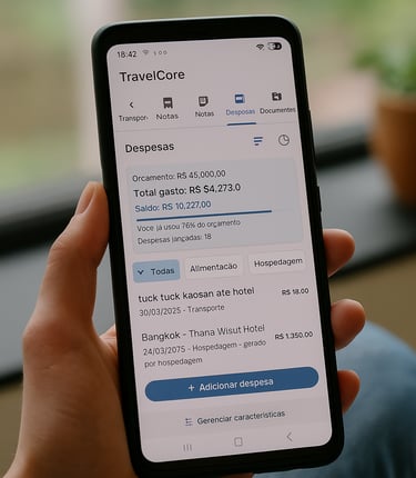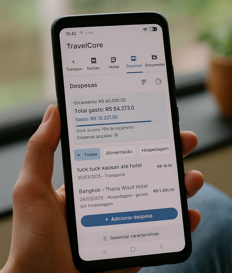 No TravelCore, você organiza roteiros, transportes, hospedagens, despesas e documentos, acompanhando tudo em tempo real, direto do celular.